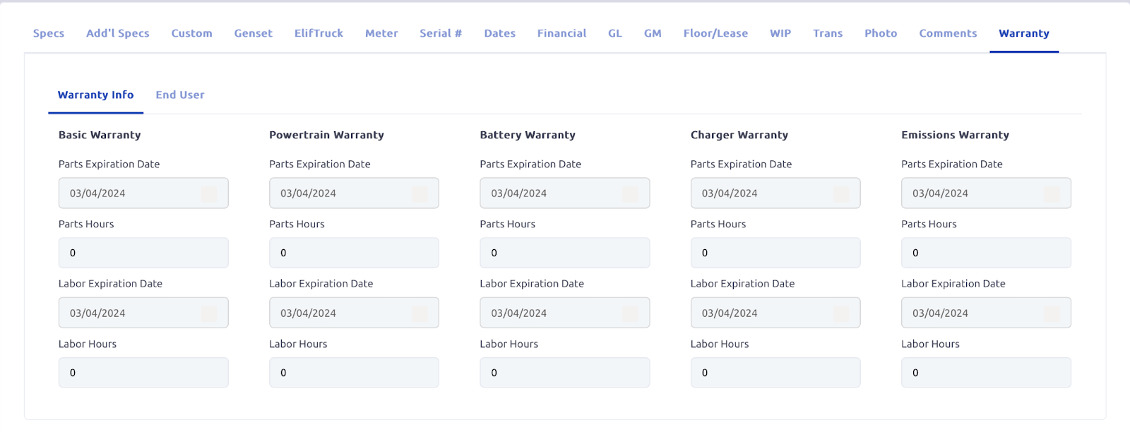 This tab provides a detailed breakdown of warranty policies for both parts and labor. Under each warranty type, you can enter the expiration dates and/or hours of coverage for parts and labor.