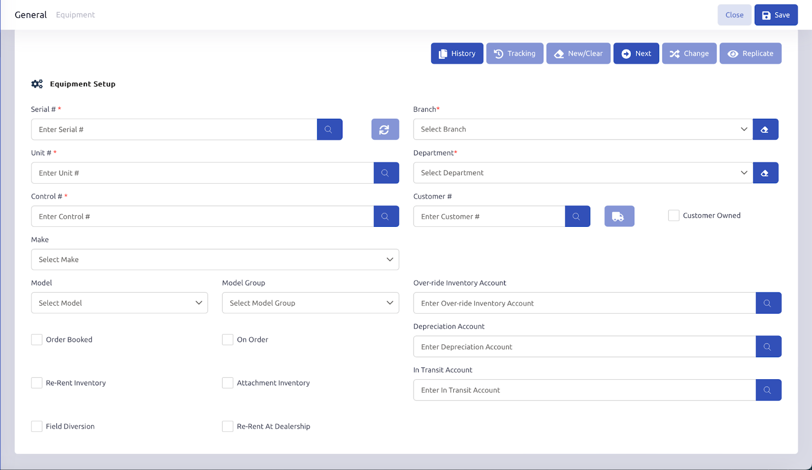 Customer Owned: This checkbox indicates whether the Equipment record is owned by a Customer. If it is set to True then the Customer # field is required.