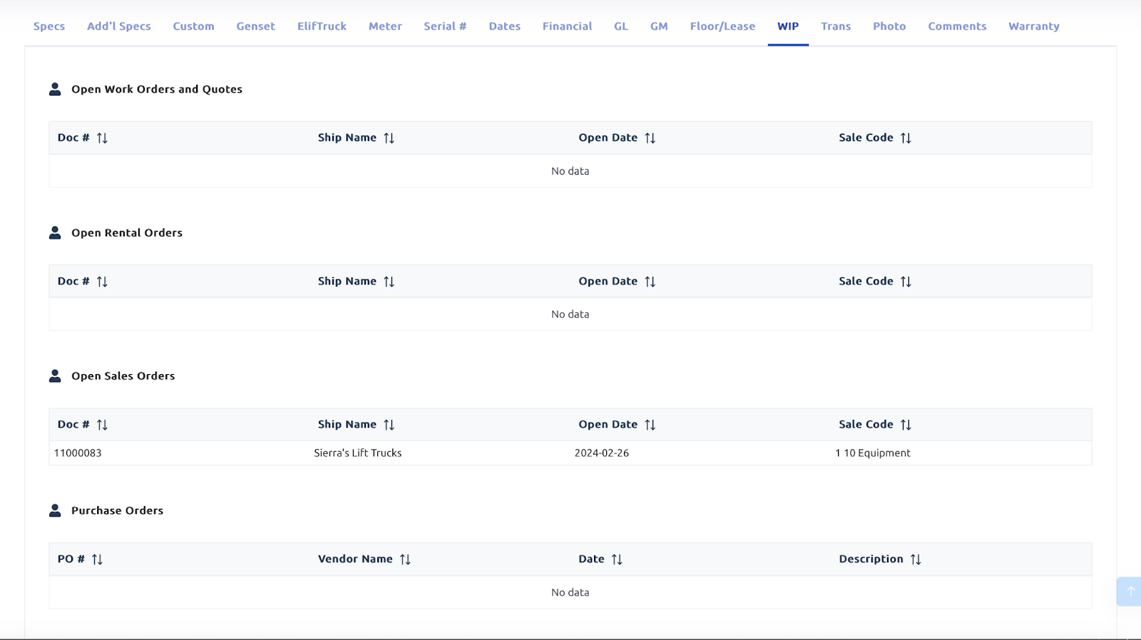 The WIP (Work in Progress) tab provides a comprehensive overview of all ongoing documents associated with a specific piece of equipment. It allows users to easily track and manage various types of open transactions. Here’s an outline of the sections within the WIP tab: